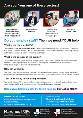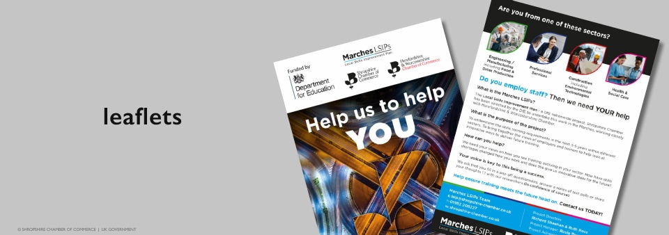 The Marches LSIPs was a new Department of Education initiative to understand skills training in the area for the next 3-5 years. A brand identity was required which would work alongside the core Shropshire Chamber brand but would have a point of difference to help the collateral stand out at networking and other business events. From this, associated assets were developed to promote the project, one of which were the A5 Leaflets.